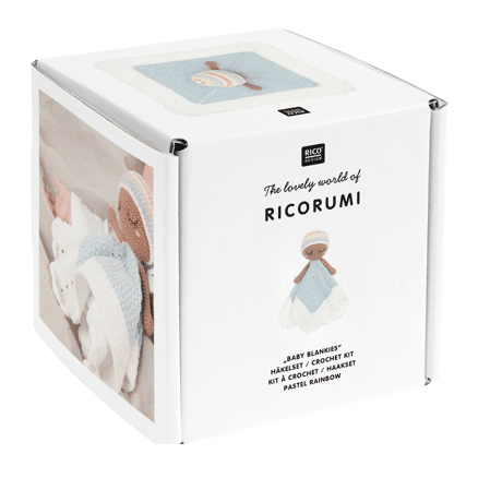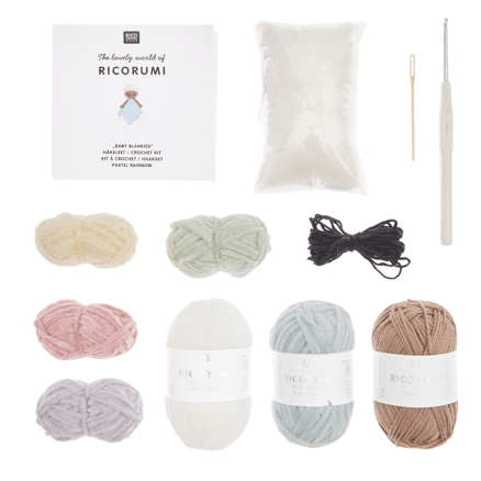 De haakset, die nodig is voor het haken van dit schattige babydekentje in pastelkleurige regenboogkleuren, bevat gedetailleerde instructies, een naai- en haaknaald en de benodigde vulling voor het hoofdje. Het garen bestaat uit twee bollen van de knuffelzachte Ricorumi Nilli Nili, één bol van de klassieke Ricorumi dk en wat restjes garen voor individuele details.
